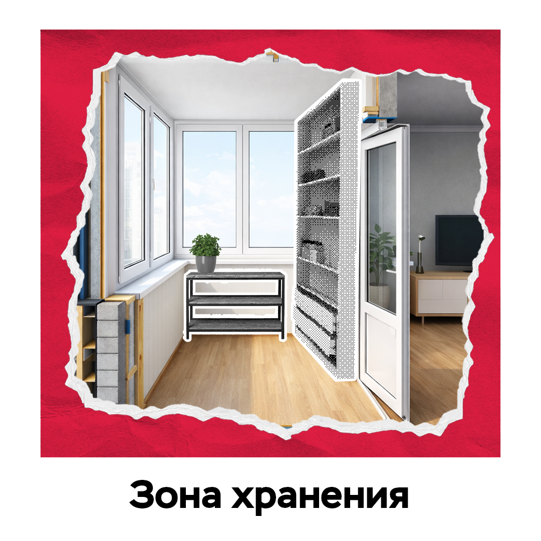 Расположите на балконе стеллажи и шкаф — так вы освободите площадь квартиры от сезонного инвентаря.
